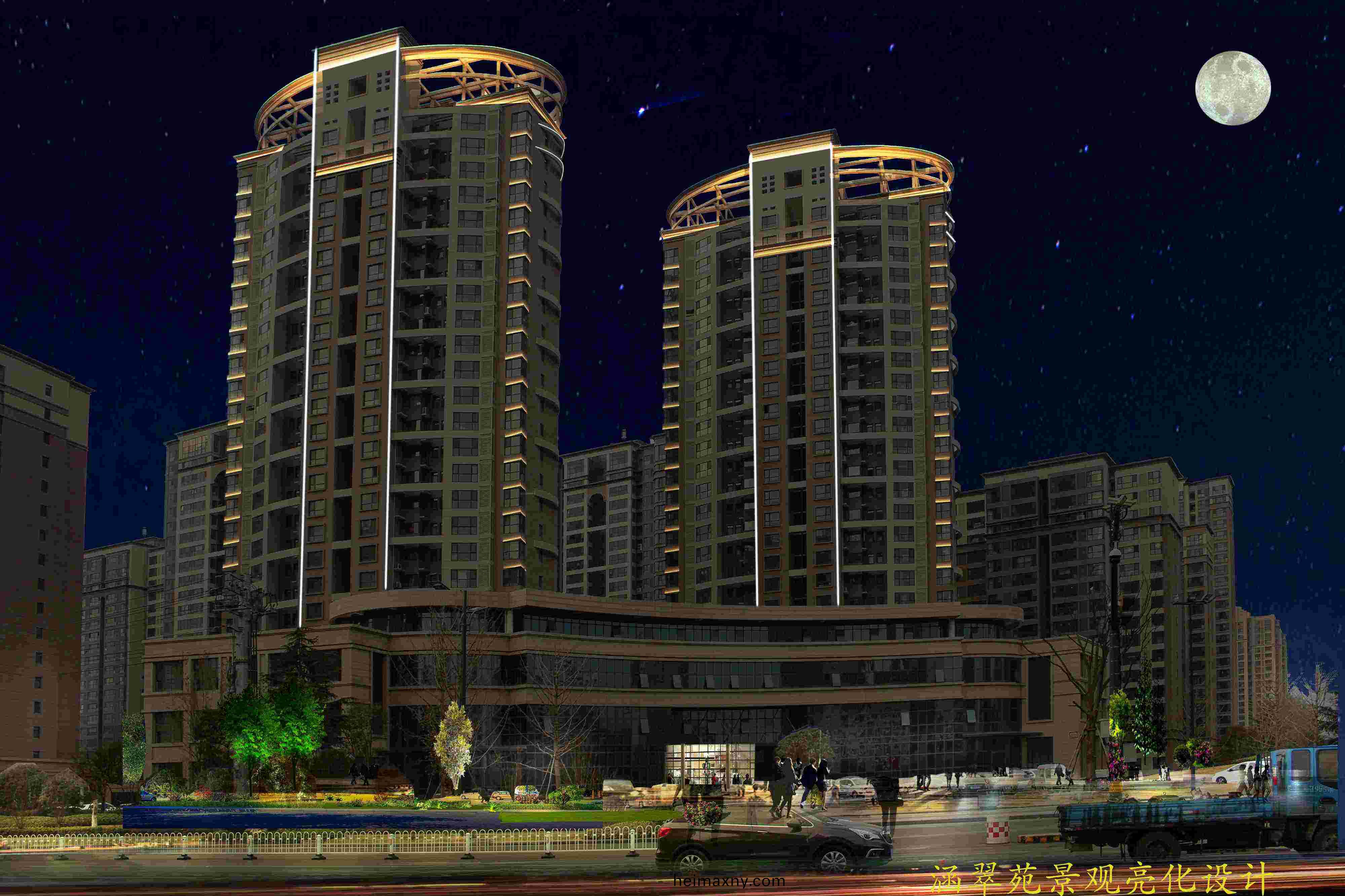 整體風格簡潔、大方,光色上以黃光爲主,煗白色爲輔,線(xian)條簡潔明了,突齣建築物整體佈跼結(jie)構。